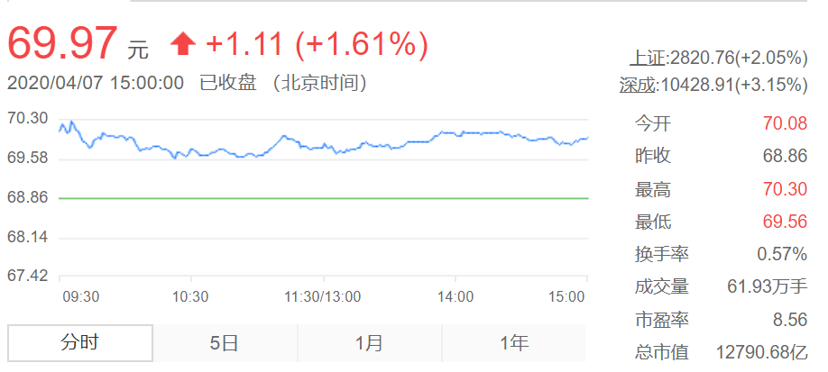 4月7日中国平安股票收盘价69.97元,涨幅1.61%。