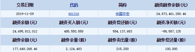 中国平安(601318)2019-11-28融资融券信息显示,中国平安融资余额24794399137元,融券余额169583485.2元,融资买入额266289611元,融资偿还额280082914元,融资净买额-13793303元,融券余量2009283股,融券卖出量57300股,融券偿还量128300股,融资融券余额24963982622.2元。