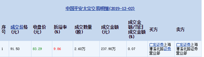 2019年12月09日,中国平安发生了1笔大宗交易,总成交数量为2.50万股,总成交金额为232.50万元,成交价格为93.00元,当日收盘报价83.65元,涨幅-1.29%,成交金额38.63亿元;大宗交易成交金额占当日成交金额0.06%,溢价11.18%。