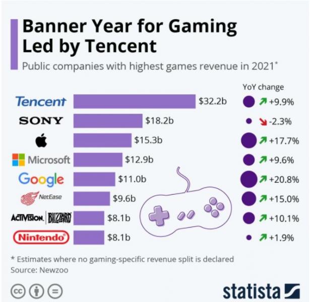 排在首位的是腾讯,拥有《英雄联盟》和《和平精英》等游戏,该公司 2021 年的收入为 322 亿美元,比上一年增 9.9%。索尼以 182 亿美元的收入位居第二,但同比下降 2.3%。
