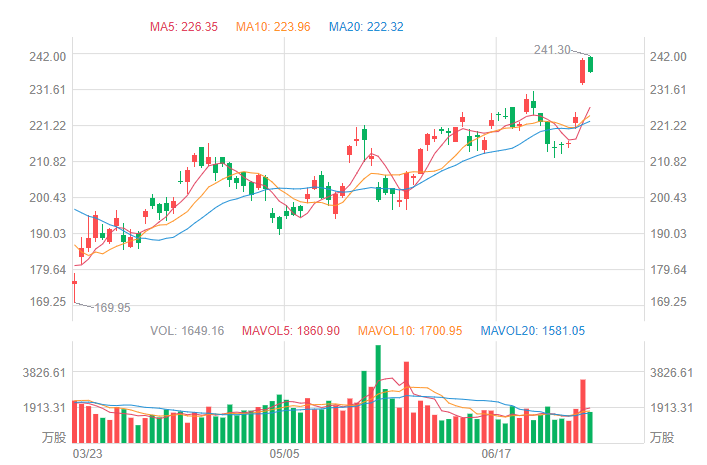 昨收:240.000 最低价:236.130 成交额:39.36亿 内盘:799.1万