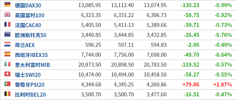 欧洲主要指数多数走低,德国DAX指数跌0.99%,英国富时100指数跌0.92%,法国CAC40指数跌0.73%,欧洲斯托克50指数跌0.76%。