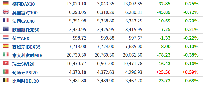 欧洲主要指数多数走低,德国DAX指数跌0.25%,英国富时100指数跌0.72%,法国CAC40指数跌0.20%,欧洲斯托克50指数跌0.21%。