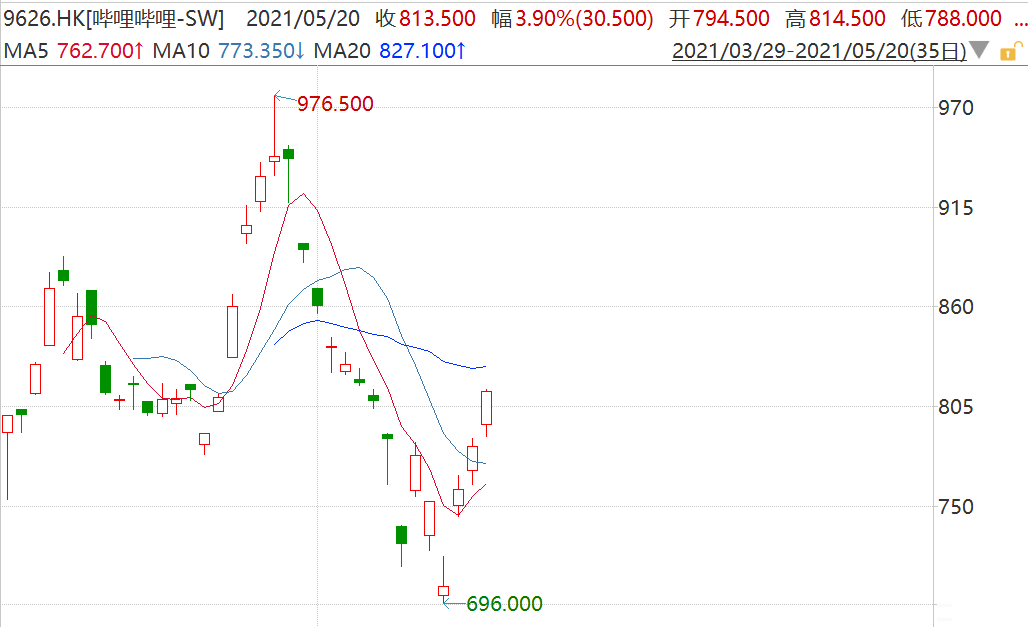 哔哩哔哩(9626.HK)盘中拉升一度涨4%报814.5港元,为连续第三日上涨,最新市值3131亿港元。隔夜哔哩哔哩美股收涨1.39%报102.46美元,折算成港股市场价格为795.64港元/股。哔哩哔哩入选了格隆汇2021年“下注中国”十大核心潜力资产名单。