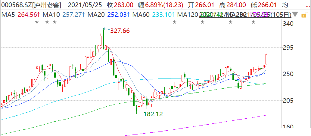 今日一线白酒股全线大涨,其中,泸州老窖(000568.SZ)盘中一度涨超7%报284元,领涨板块,股价创2月底以来新高,市值超4100亿元。