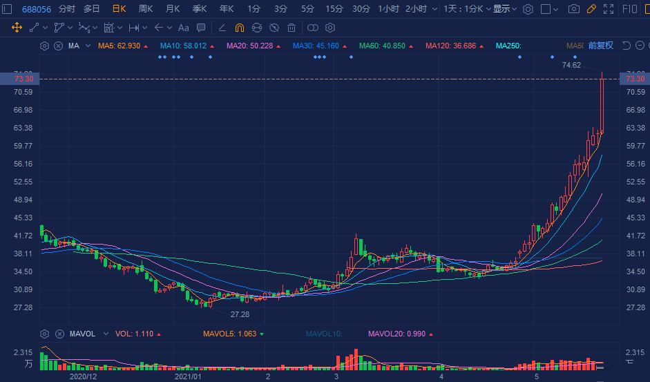 莱伯泰科(688056.SH)拉升逼近涨停,盘中高见74.62元再度刷新历史新高价,总市值达50亿元。