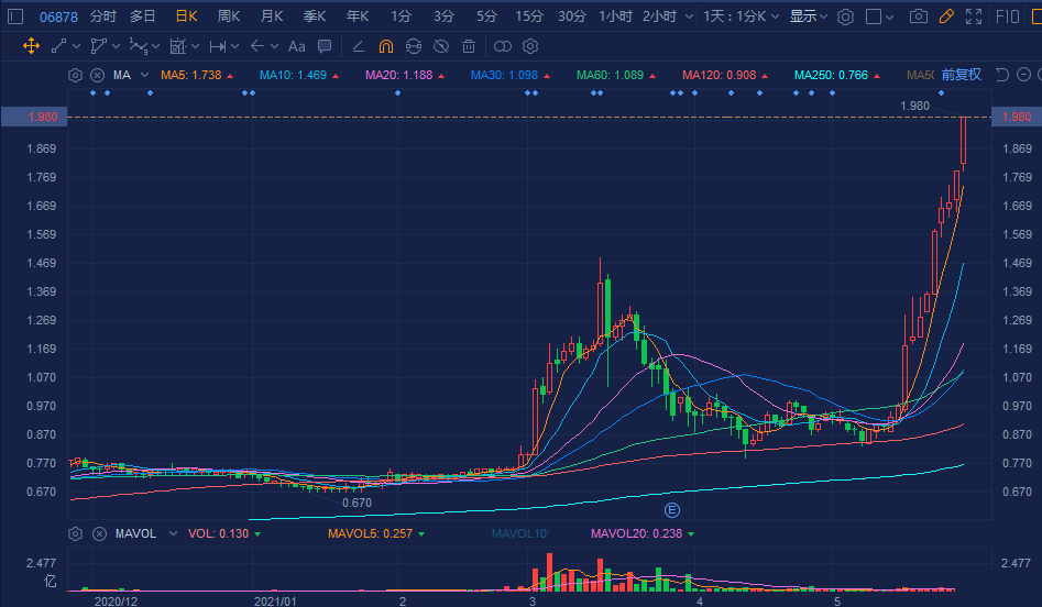 鼎丰集团(06878.HK)延续上涨行情,现大幅拉升涨10.61%,11日连升近120%。报1.98港元创2015年8月以来新高价,总市值超140亿港元。