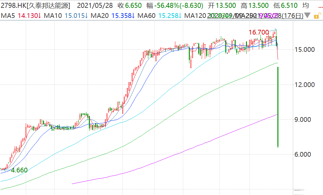 久泰邦达能源(2798.HK)暴跌57.4%报6.51港元,最新市值107亿港元。该股在2020年收涨375%后,年内一度再涨近70%,昨日盘中一度创出历史新高价16.7港元。公司是一家采煤公司,经营位于贵州省盘州市西松山煤田的两个地下煤矿,即红果煤矿及苞谷山煤矿。年报显示公司第一大股东持股比例为53.5%。