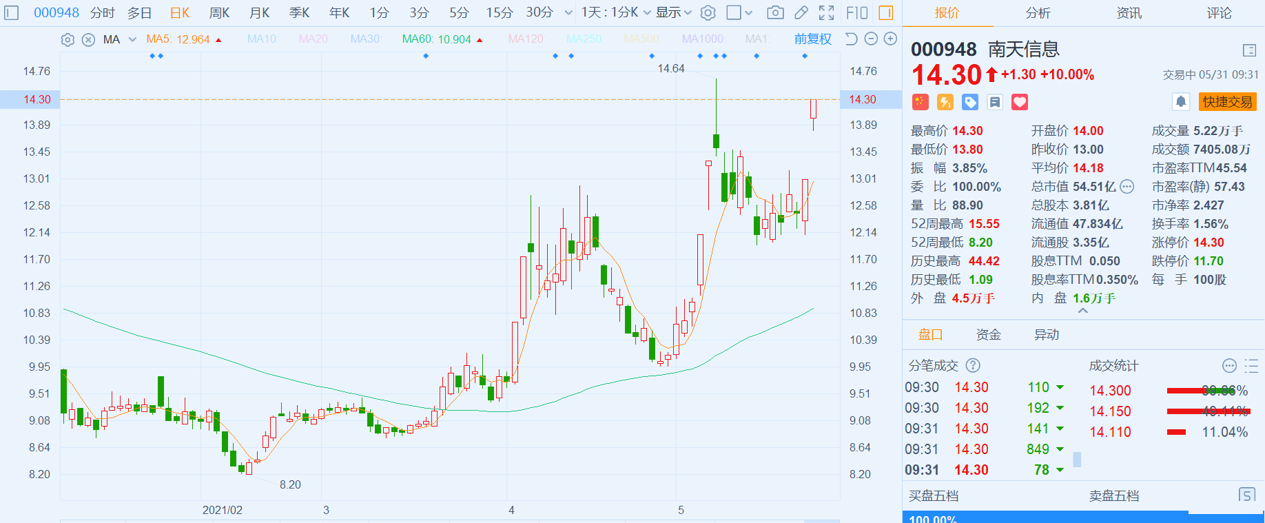 南天信息(000948.SZ)高开高走,现已封死涨停板,报14.3元,总市值55亿元。