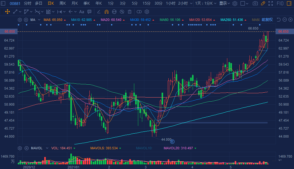 中升控股(0881.HK)拉升涨3.25%,报66.65港元再度刷新历史高价,总市值超1540亿港元。