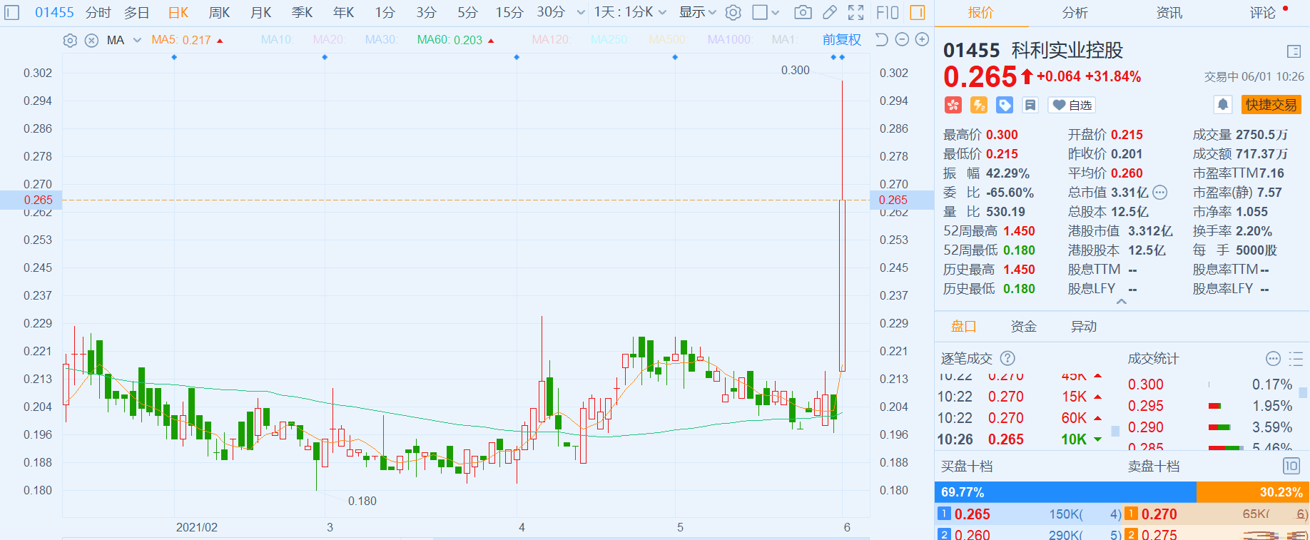 科利实业控股(1455.HK)高开高走,现大涨近32%,报0.265港元,总市值3.3亿港元。