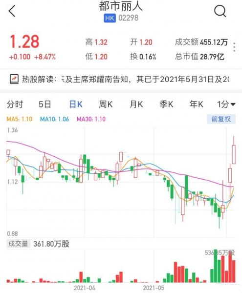 都市丽人(2298.HK)今日续涨,暂四日连升累涨约32%;现报1.28港元,涨8.47%,暂成交455万港元,最新市值28.79亿港元。