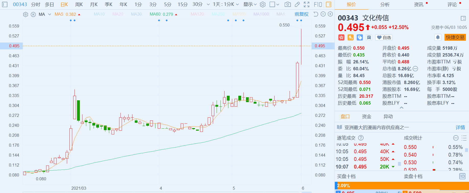文化传信(0343.HK)复牌大涨12.5%,报0.495港元,高见0.55港元创逾三年新高,最新总市值8亿港元。