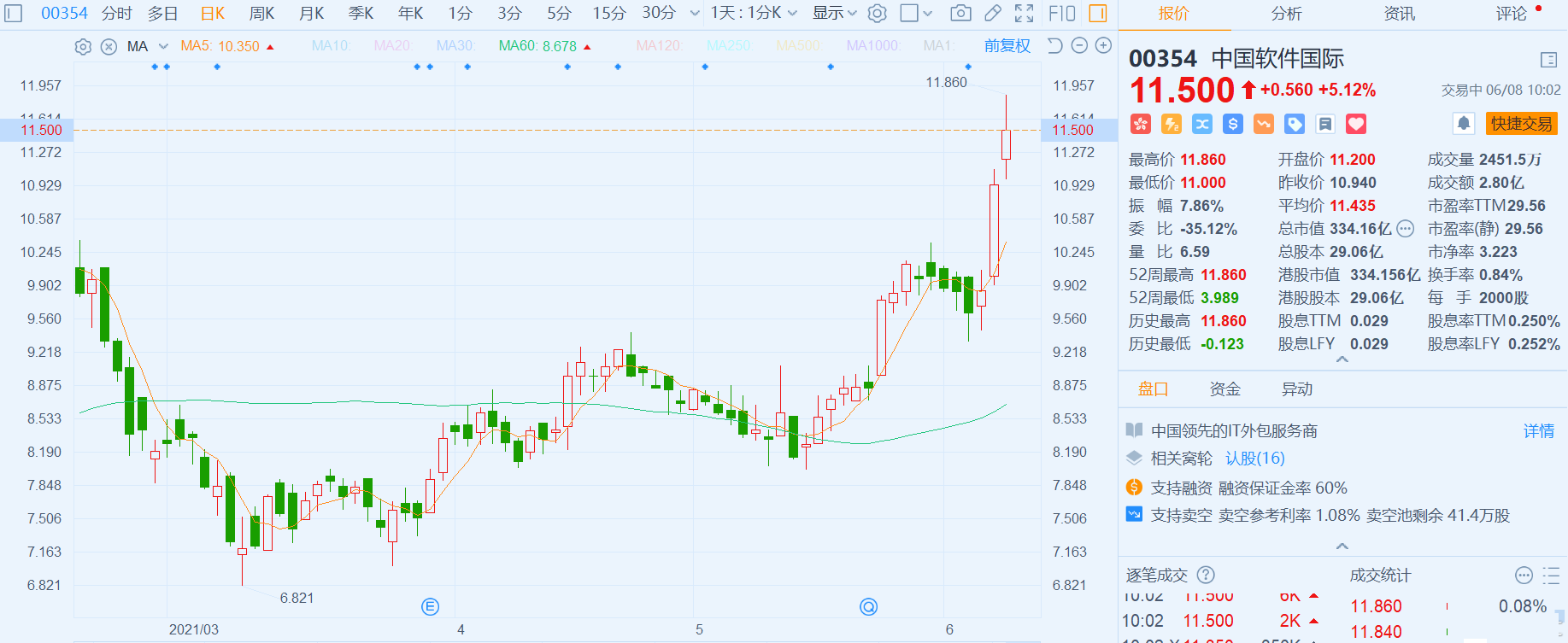 中软国际(0354.HK)涨逾5%,报11.5港元,高见11.86港元创历史新高,近三个交易日累计涨幅达20%,最新总市值334亿港元。