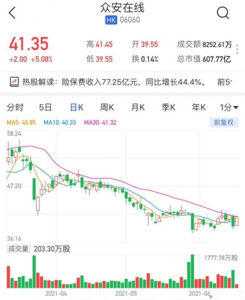 众安在线(6060.HK)高开高走,现报41.35港元,涨5.08%,暂成交8252万港元,最新市值607亿港元。