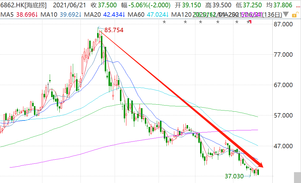 海底捞继上周跌破2000亿市值之后,今日股价再度跌超5%,再度跌破2000亿市值至1988亿港元。海底捞最近四个月股价最大跌幅一度达56.9%,市值蒸发近2400亿港元,海底捞张勇痛失新加坡首富之位。