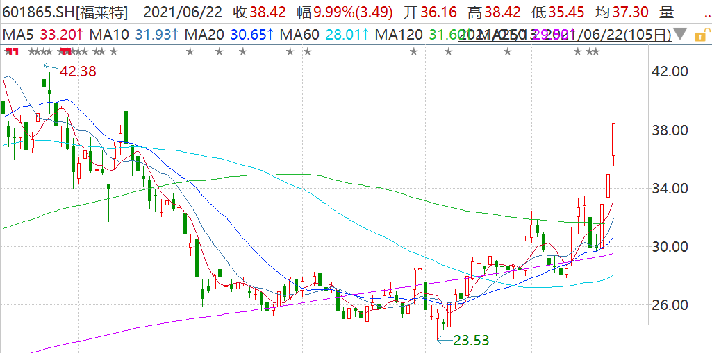 福莱特(601865.H)午后再度封涨停板,报38.42元,近3个交易日出现2个涨停板,股价创4个月新高;H股涨超7%报29.1港元,创3月以来新高;福莱特最新市值761亿人民币。