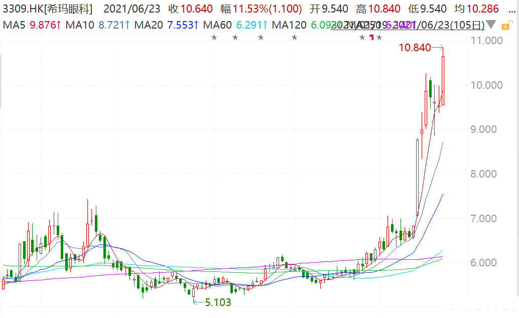 希玛眼科(3309.HK)继续拉升,盘中最高涨超13%至10.84港元,股价创2018年3月以来新高,市值超120亿港元;该股月内累涨70%,位2018年以来最大月度涨幅。