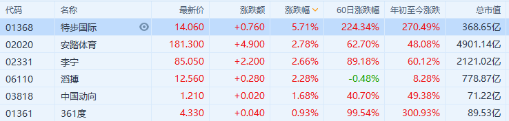 体育用品股继续走强,特步涨超5%,市值近370亿港元;李宁涨超2%,市值超2100亿港元;安踏涨超2%,市值逼近5000亿港元;三股盘中均创历史新高。自特步于6月15日早间宣布获高瓴认购5亿港元可换股债券后,该股迄今已七日连升累涨约60%,年内已累涨超2.7倍。瑞信认为特步近期获高瓴投资后可去除投资者对公司配股的忧虑,而高瓴的往绩亦为公司增加信誉,将目标价大升238%至13.2港元,评级升至“跑赢大市”,2020/21年盈利预测分别升8%及11%,以反映品牌势头强劲、平均销售单价提升及产品组合改善等。此外,瑞银最新发研报指,考虑到李宁毛利水平提升,在国产趋势下品牌发展良好,预期今年上半年盈利增长将强劲,将目标价上调54%至100港元,维持“买入”评级。