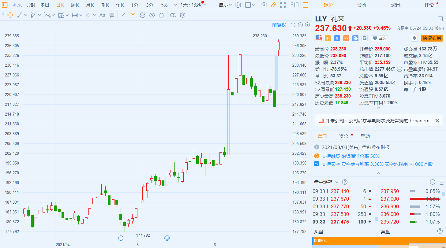礼来(LLY.US)今日股价大幅高开,现涨幅为9.46%,报237.63美元,暂成交3.15亿美元,最新总市值为2277.45亿美元。