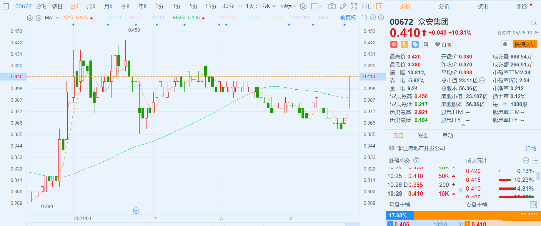 众安集团(0672.HK)小幅高开,现涨幅扩大至近11%,报0.41港元,总市值23亿港元。