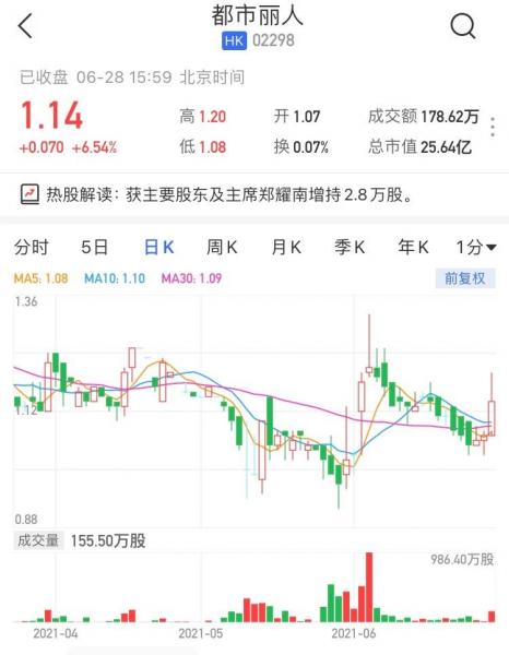 都市丽人(2298.HK)高开高走,一度大涨12%至1.2港元,现报1.14港元,涨幅收窄至6.54%,最新市值25亿港元。