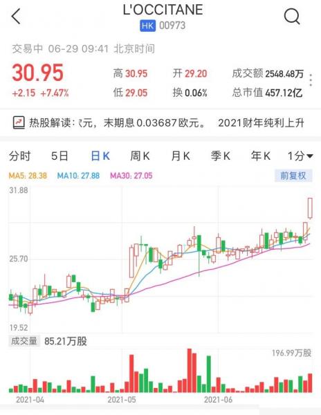 欧舒丹(0973.HK)高开高走,现涨7.47%报30.95港元,股价续创历史新高,最新市值457亿港元,