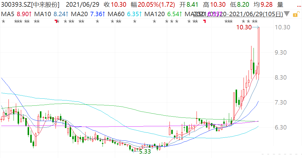 中来股份(300393.SZ)直线拉升封涨停板,报价10.3元,股价创去年12月以来新高,市值112亿元。