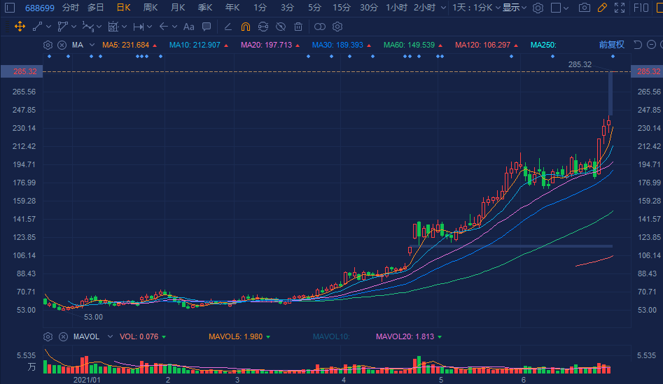 明微电子(688699.SH)竞价一字涨停,报285.32元创历史新高,总市值超212亿元。明微电子29日公告,