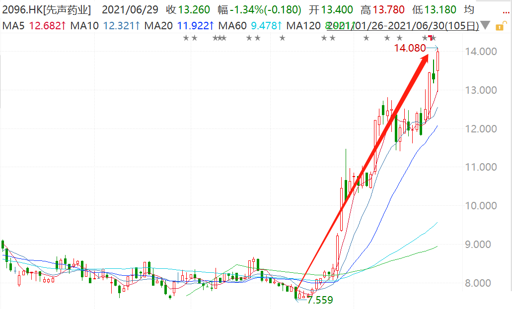 延续近期强势,先声药业(2096.HK)今日继续走强,盘中一度涨超6%至14.08港元,再创上市新高,市值超360亿港元;该股自5月中旬低位至今,累涨超80%。