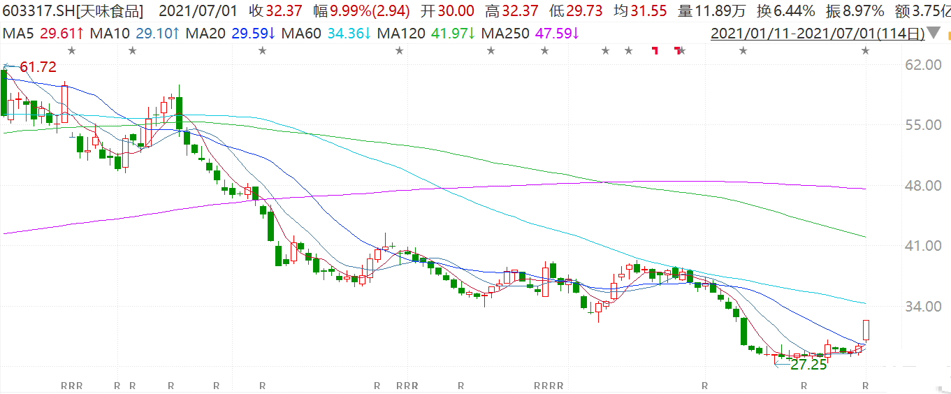 天味食品涨停报32.37元,市值245亿元;