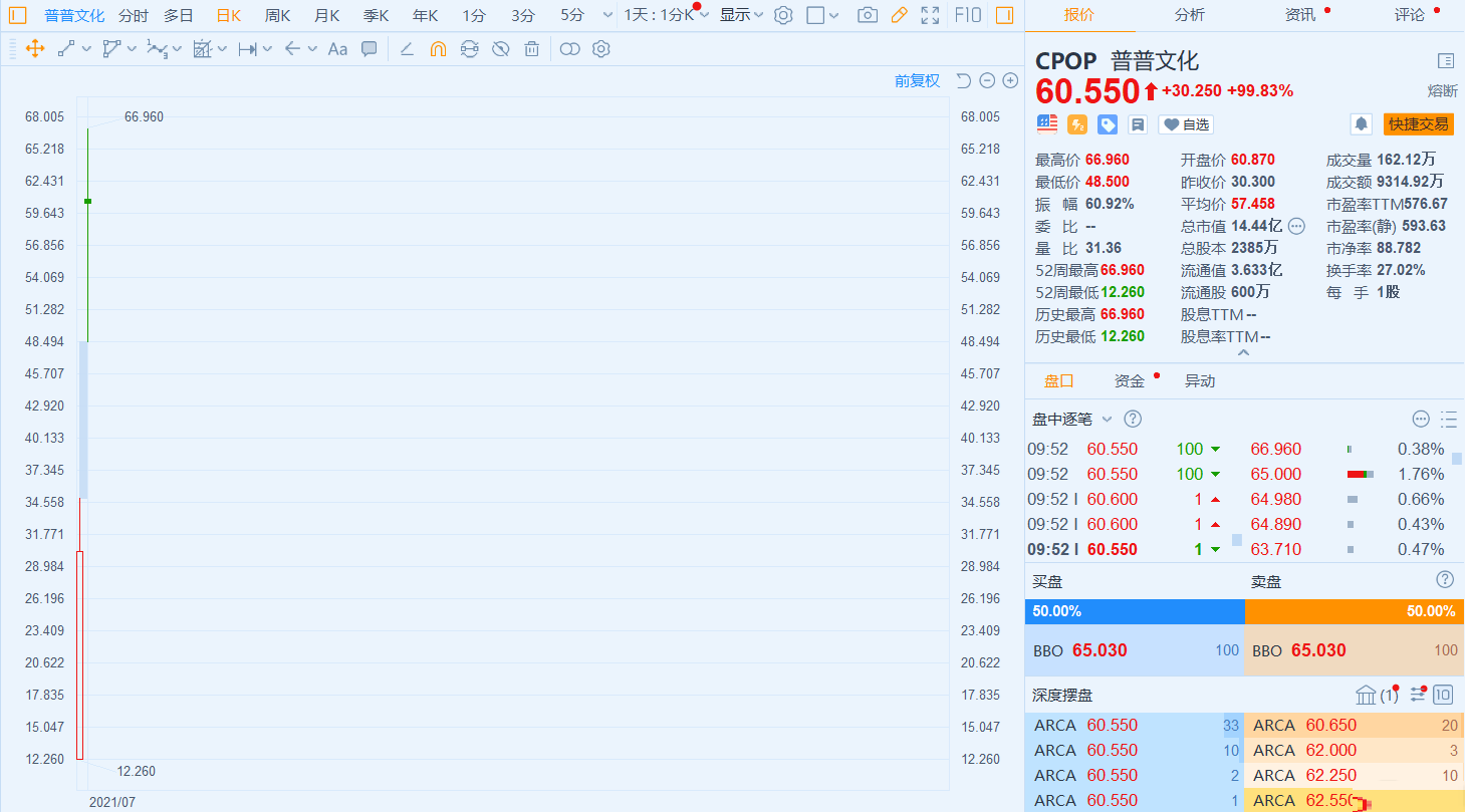 “嘻哈文化第一股”普普文化(CPOP.US)涨99.83%,触及熔断,现报60.55美元,最新总市值为14.44亿元,该股昨日首挂大涨405%。