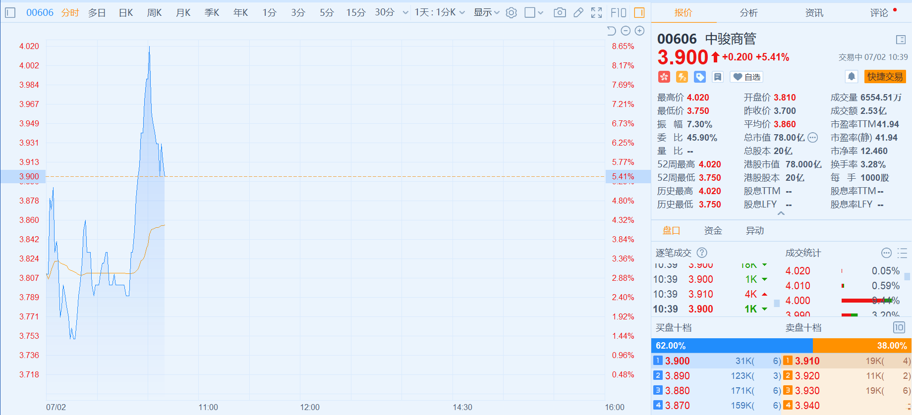 中骏商管(0606.HK)上市首日高开约3%,报3.81港元,现涨5.41%,报3.9港元,盘初高见4.02港元,最新总市值78亿港元。