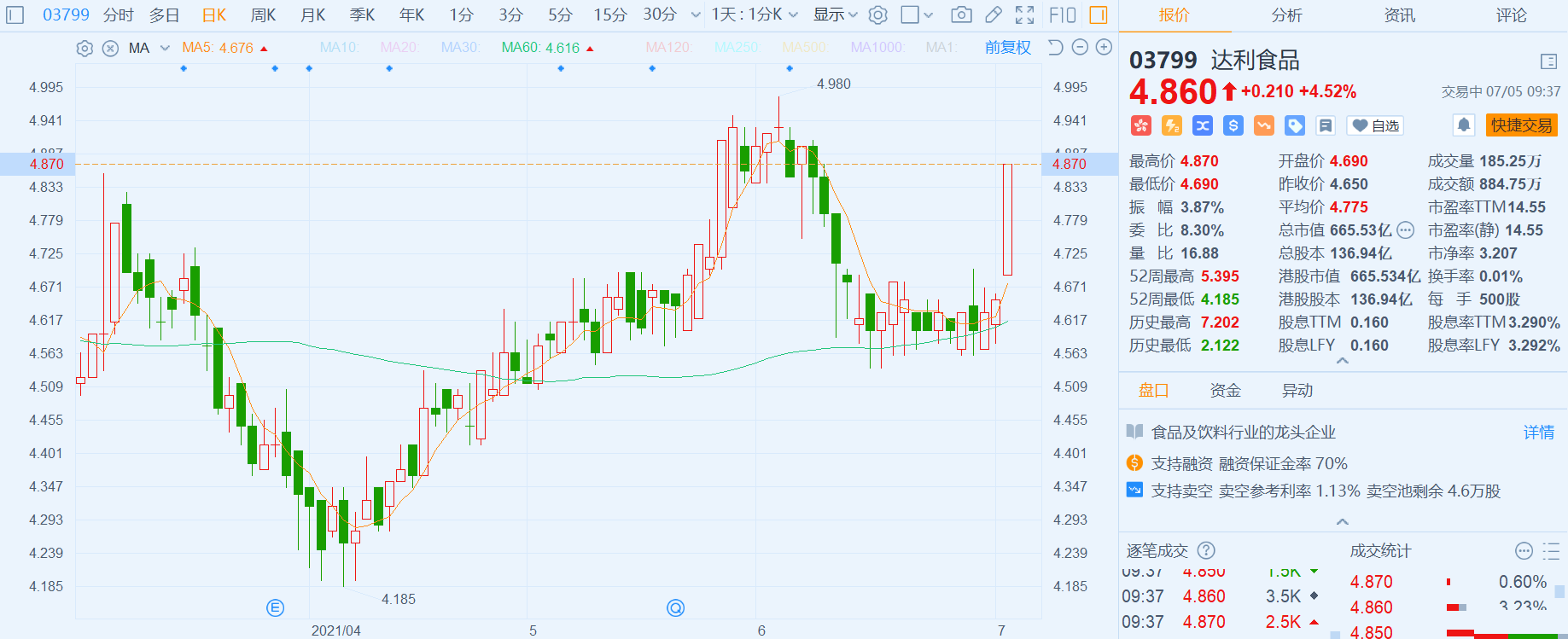 达利食品(3799.HK)高开高走,现涨幅扩大至4.52%,报4.86港元,总市值666亿港元。