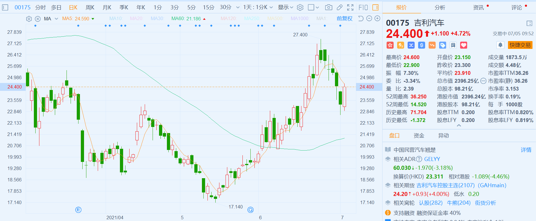 吉利汽车(0175.HK)涨4.72%,报24.4港元,总市值2396亿港元。
