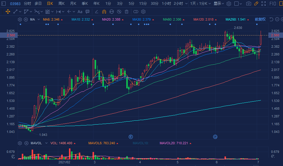 中海石油化学(3983.HK)大幅拉升涨超10%,高见2.63港元欲突破阶段高位,总市值达120亿港元。