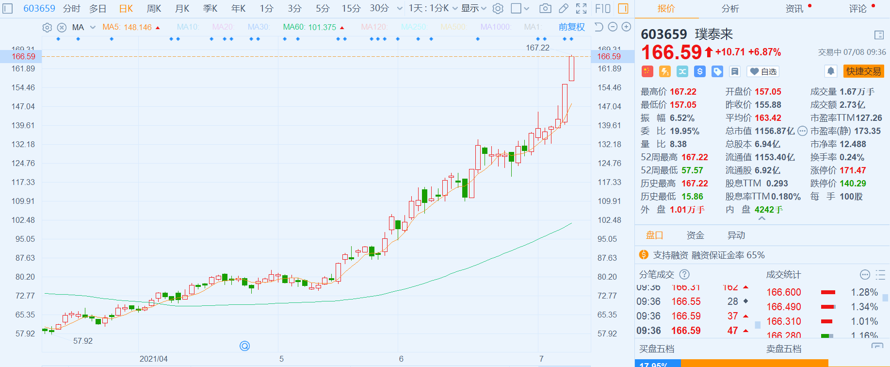 璞泰来(603659.SH)小幅高开,现涨幅扩大至近7%,报166.59港元再创历史新高,总市值1157亿港元。