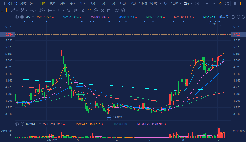 创梦天地(1119.HK)盘中一度大涨超10%,高见5.93港元创逾2年新高价,成交额放大至1.42亿港元,总市值达73亿港元。
