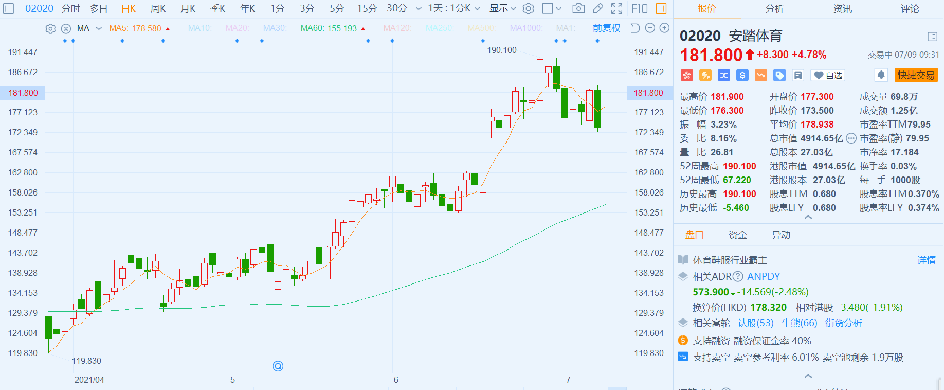 安踏体育(2020.HK)涨4.78%,报181.8港元,总市值4915亿港元。