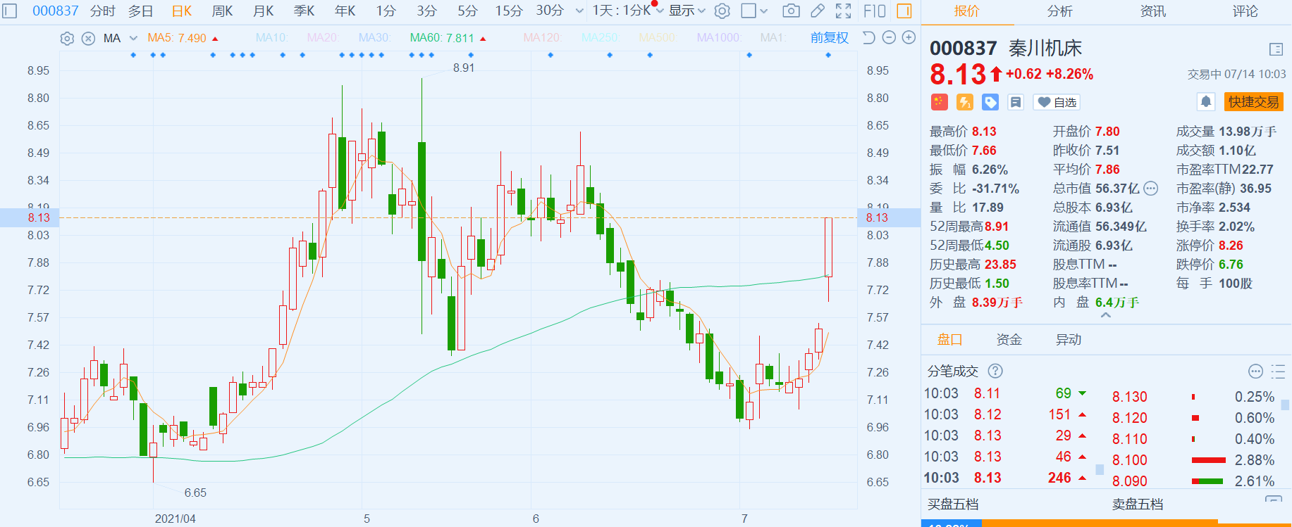 秦川机床(000837.SZ)高开高走,现大涨逾8%,报8.13元,总市值56亿元。秦川机床公布,