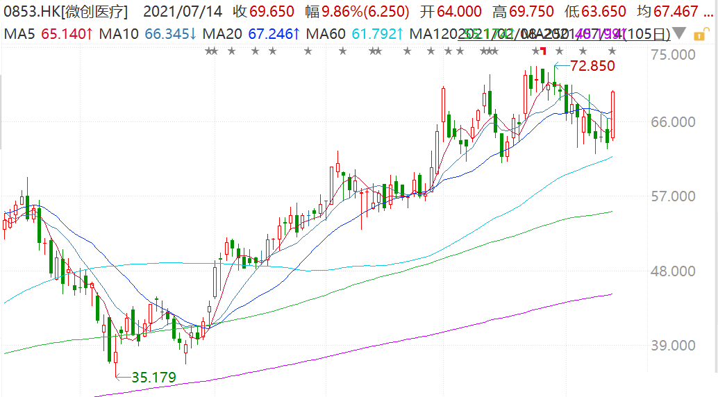 继续加速布资本局的微创医疗今日盘中拉升涨10%报69.75港元,市值逼近1300亿港元。