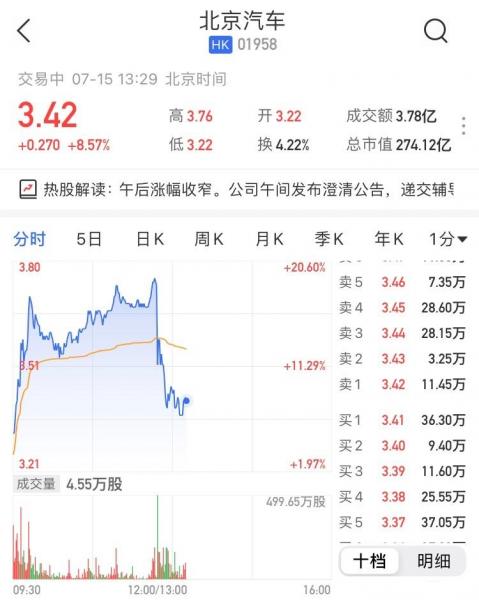 今日早盘一度大涨近20%的北京汽车(1958.HK)午后跳水,现报3.42港元,涨幅收窄至8.57%,暂成交3亿港元,最新市值274亿港元。