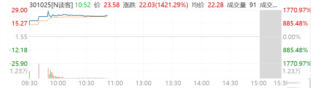 读客文化(301025.SZ)今日首日上市,盘中一度涨1770.97%报29元,市值116亿元。该股IPO价格为1.55元,发行市盈率13.06倍。