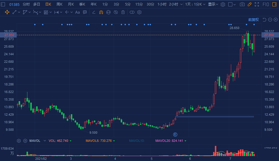 上海复旦(1385.HK)大幅拉升涨至11%,报27.85港元欲再创历史新高,暂成交1.2亿港元,总市值超190亿港元。