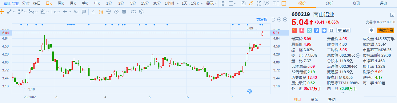 南山铝业(600219.SH)股价继续走强,盘中一度触及涨停价5.09元创2008年5月份以来新高,现报5.04元,涨幅8.8%,最新总市值602.3亿。