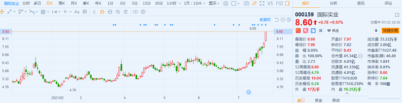 国际实业(000159.SZ)涨停,报8.6元创2019年6月份以来新高,最新总市值41.34亿,换手率6.9%;月内累计涨45%。