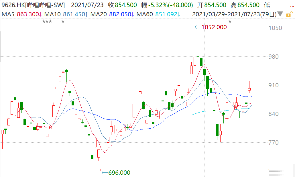 哔哩哔哩(9626.HK)低开5.32%报854.5港元,市值3284亿港元。隔夜美股哔哩哔哩收跌5.99%报108.66美元。