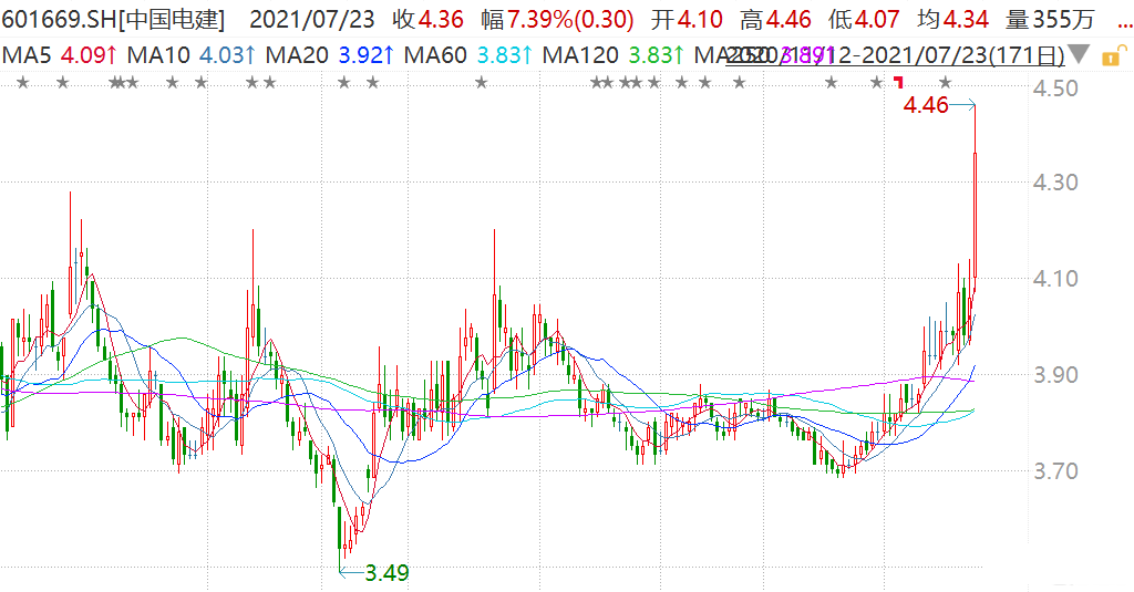 中国电建(601669.SH)一度逼近涨停报4.46元,股价创逾1年新高,市值682亿元。