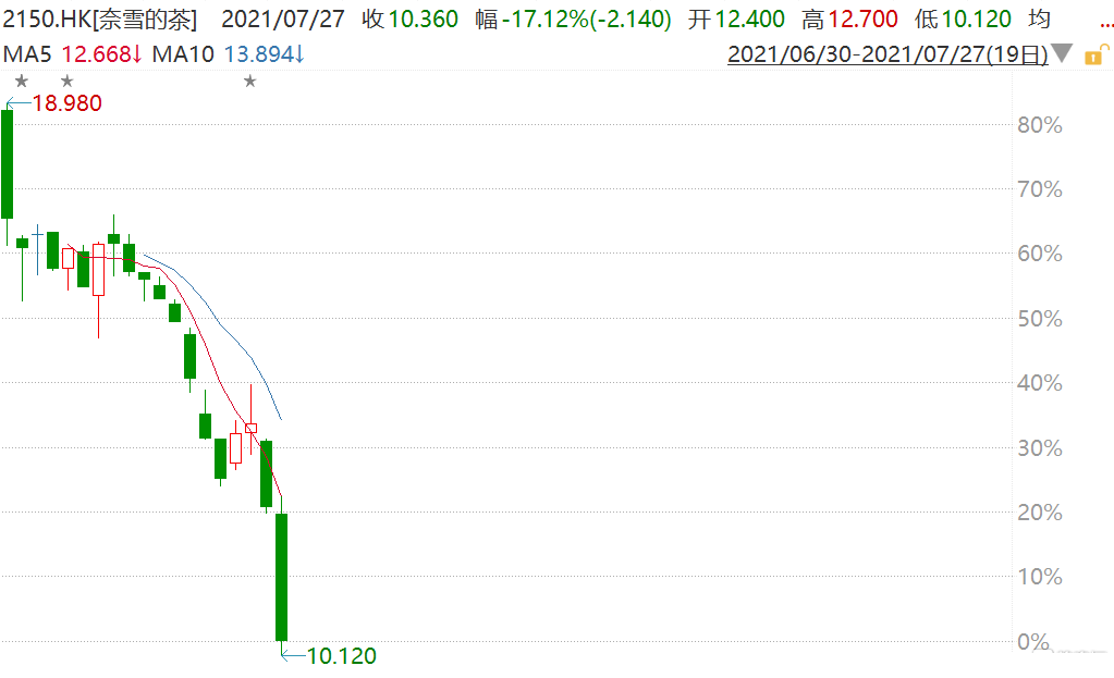 奈雪的茶(2150.HK)盘中跳水一度跌19.04%报10.12港元,再创上市新低,市值173亿港元;该股IPO价格为19.8港元,于今年6月30日上市。