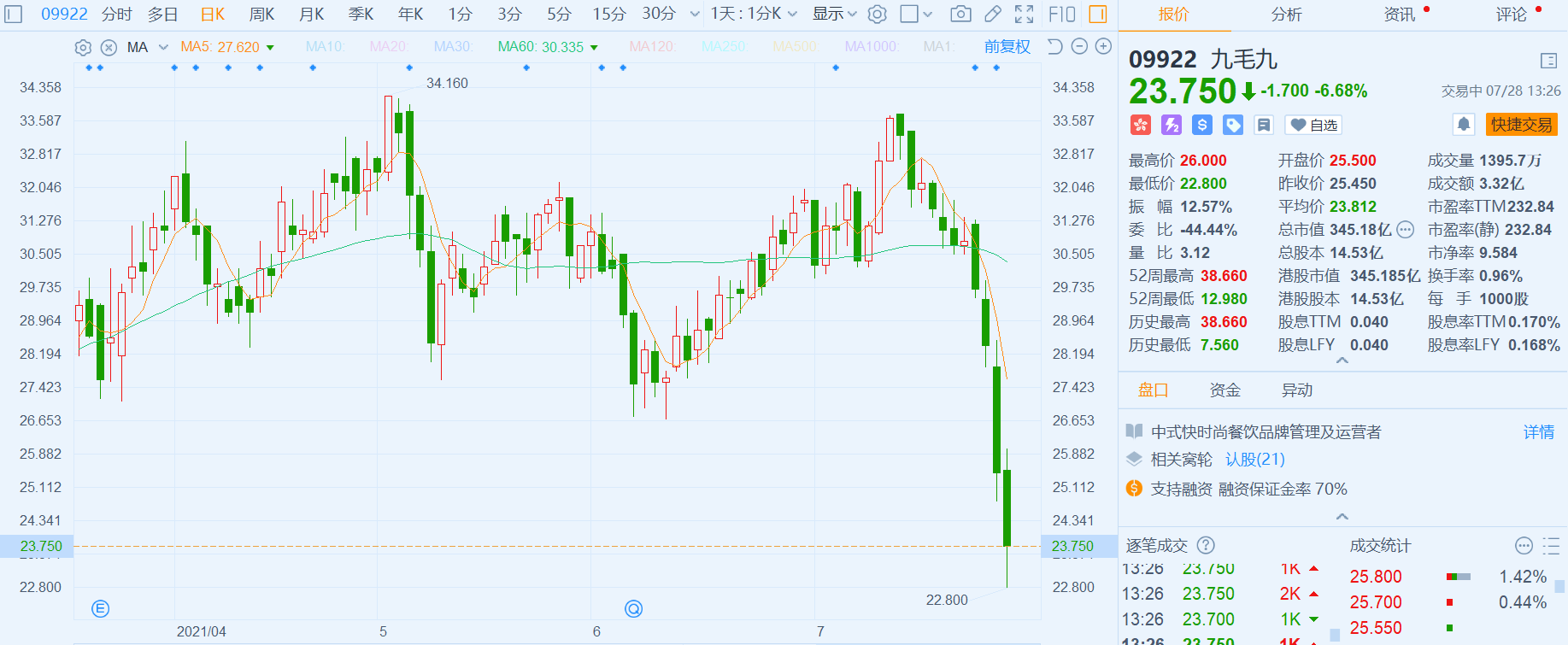 九毛九(9922.HK)下跌6.68%,报23.75港元,低见22.8港元创逾半年新低,近11个交易日累跌超30%,最新总市值345亿港元。